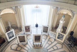 The artwork Pilgrim Notes, displayed here, is a graphic installation that reinterprets places visited by the artist at different moments in time. Through the process of memory and its documentation, these places transitioned from drawings and notes into a work featuring multiple processes and exhibition formats. Presented here are 6 of the 20 wooden plates worked with power tools that make up the complete installation, currently exhibited at the MAR Museum in Mar del Plata, along with 6 prints on fabric in blue tones on the reverse side of each panel. This set of wooden plates, carved on both sides, serves as engraving matrices and is arranged in relation to the circular space that contains them.